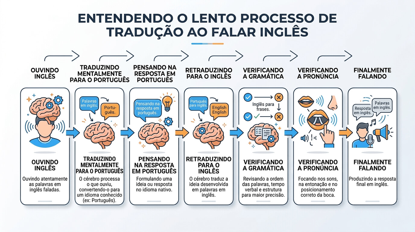 Você ouve algo em inglês → Traduz mentalmente para português → Pensa na resposta em português → Traduz novamente para inglês → Confere a gramática → Confere a pronúncia → E só então tenta falar.